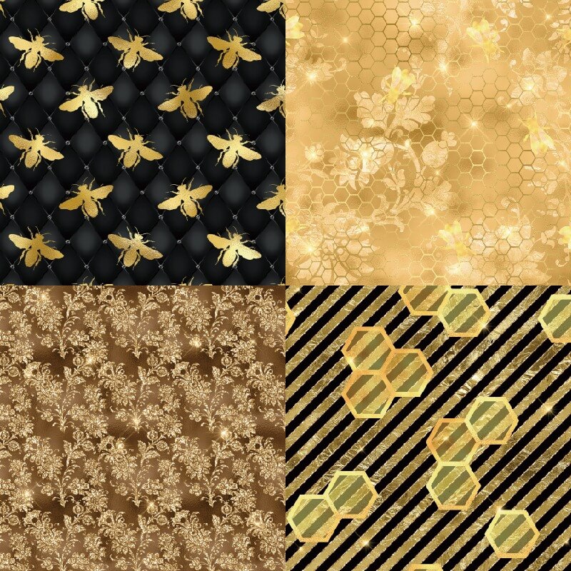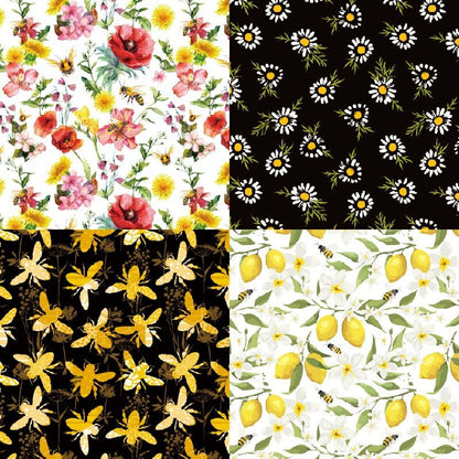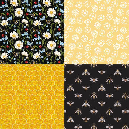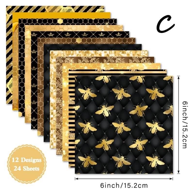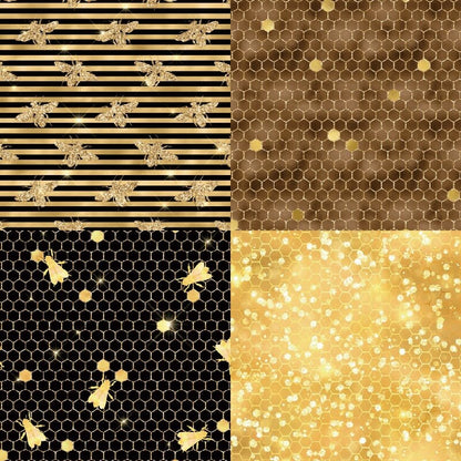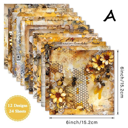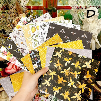 Bee-themed scrapbook paper, using bright yellow and black color combination, the pattern incorporates lovely bees, flowers and hive elements, the overall design is full of lively and vivid atmosphere, but also with a natural and fresh feeling. Suitable for handbook, greeting card, collage and other creations, adding warmth and natural atmosphere!