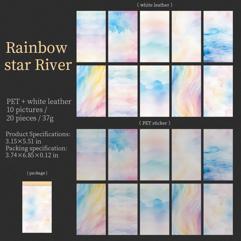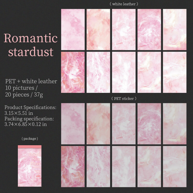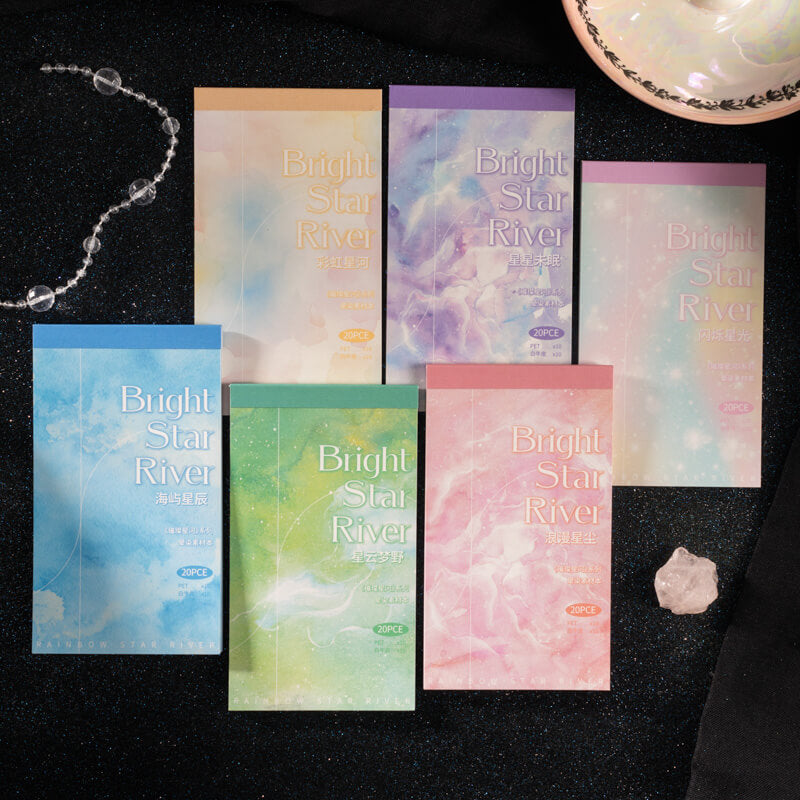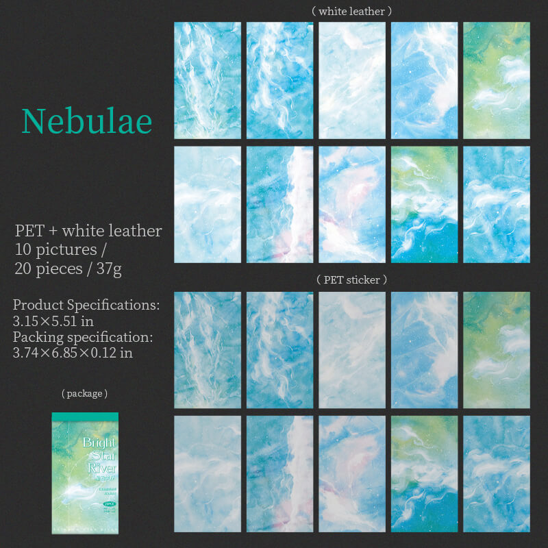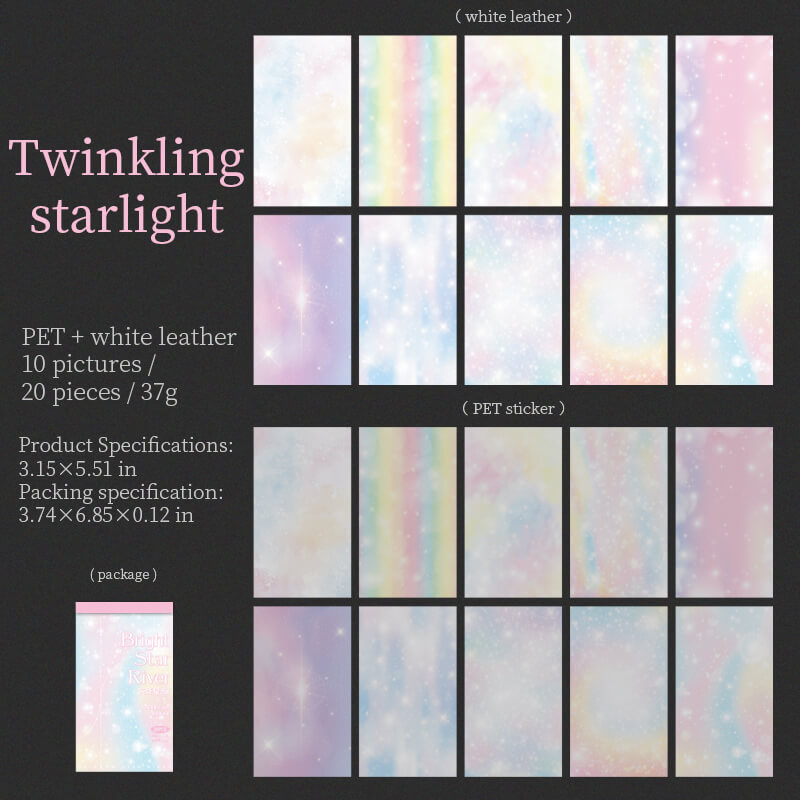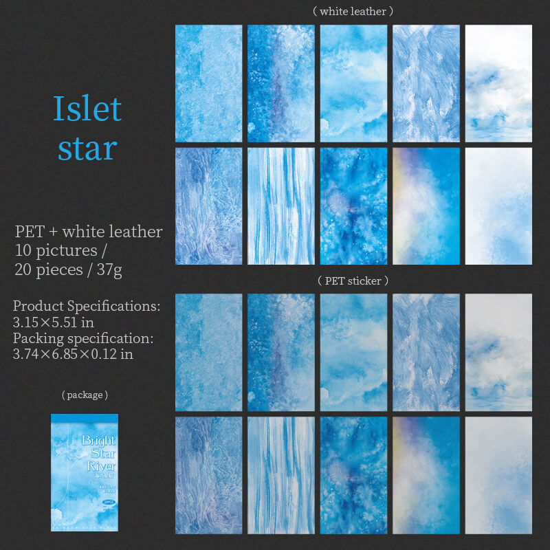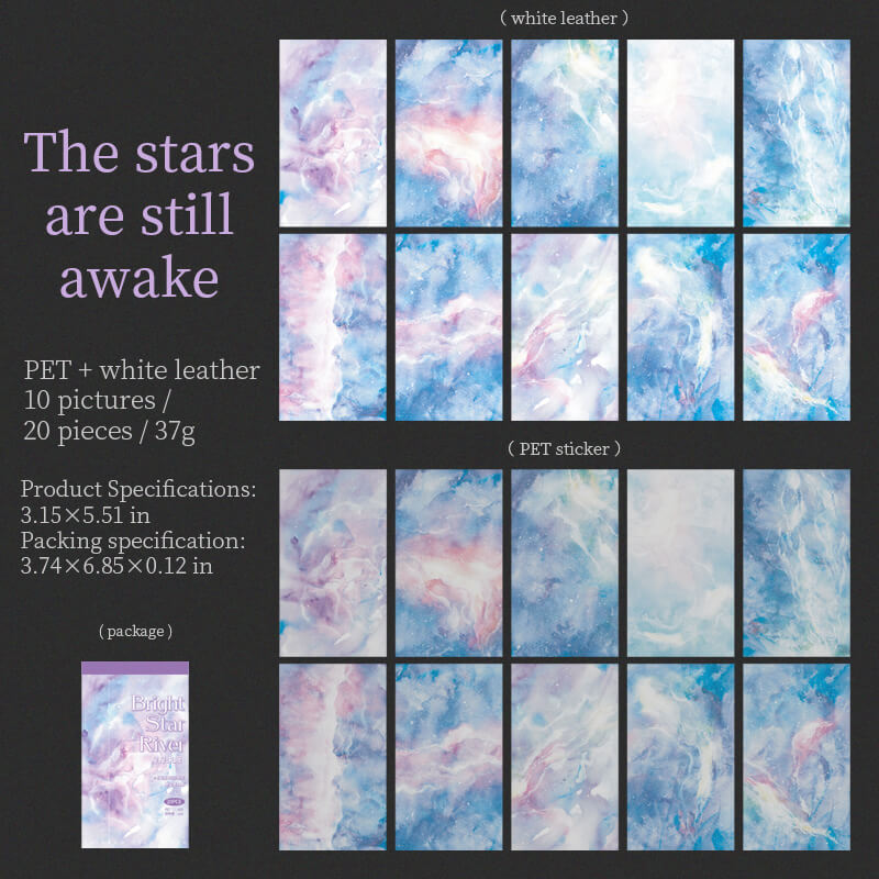 Bright Star River Material Book is a handbook tool full of dreamy starry sky elements, inspired by the vastness of the stars. Each model has 10pcs PET stickers and 10pcs white kraft material paper, suitable for decorating diary, handbook, greeting cards, etc., to create a unique atmosphere of the universe!