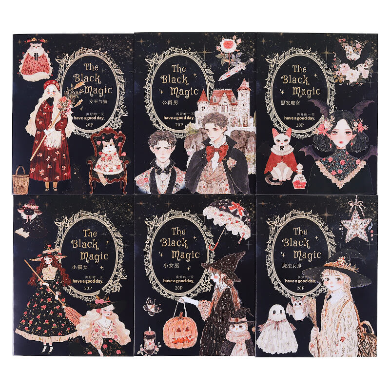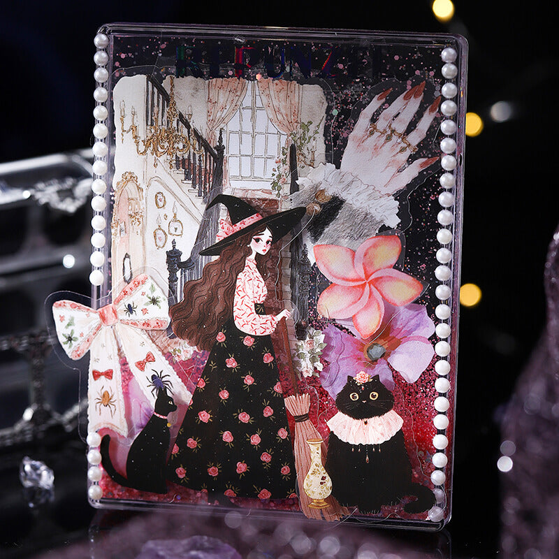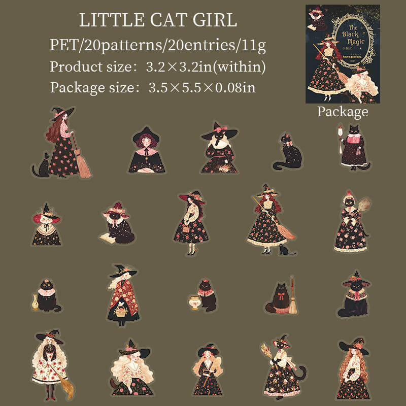 Cute Magic Witch Stickers present a little witch in a delicate magic robe, wearing a star hat and holding a sparkling wand. Her eyes are full of curiosity and innocence, and she carries a kitten, showing a relaxing and enjoyable magical world, perfect for decorating handbooks and small objects.