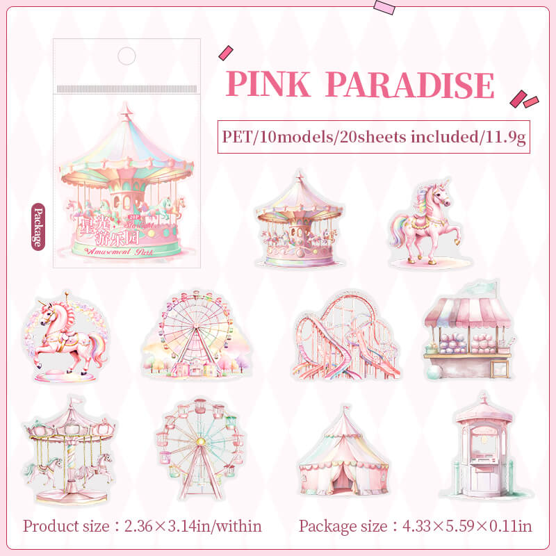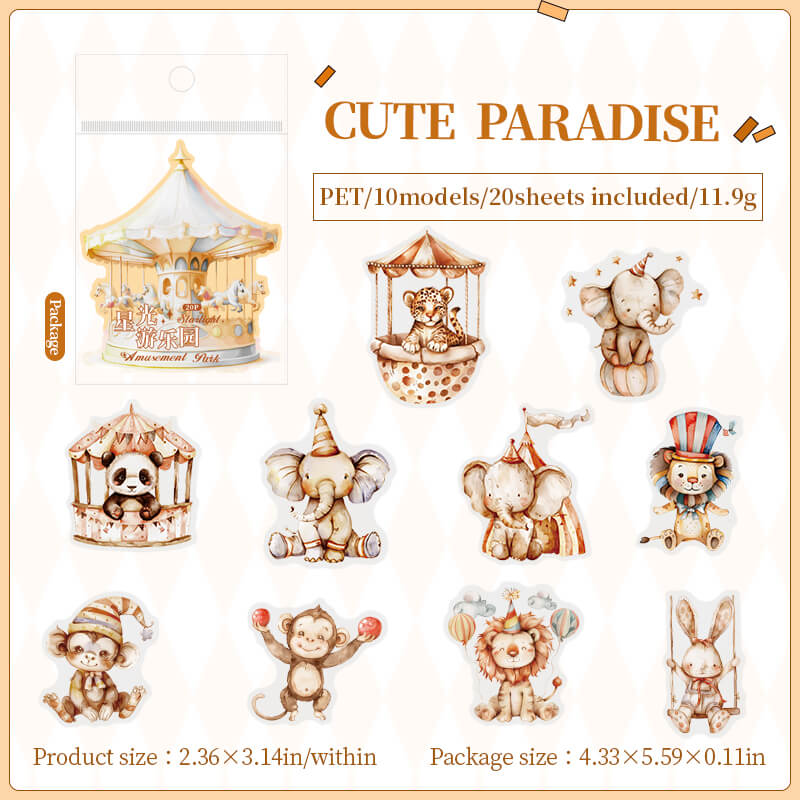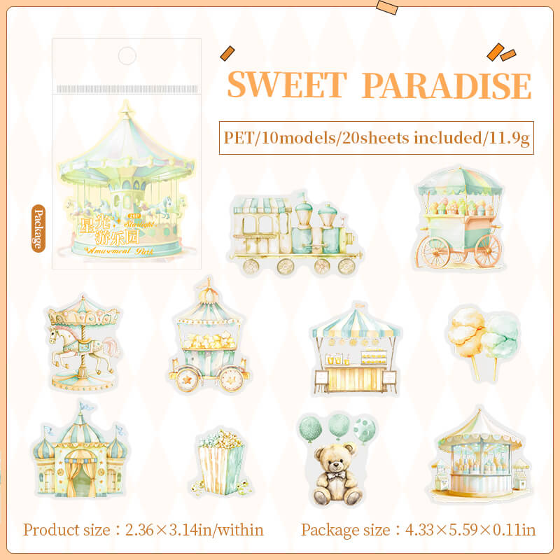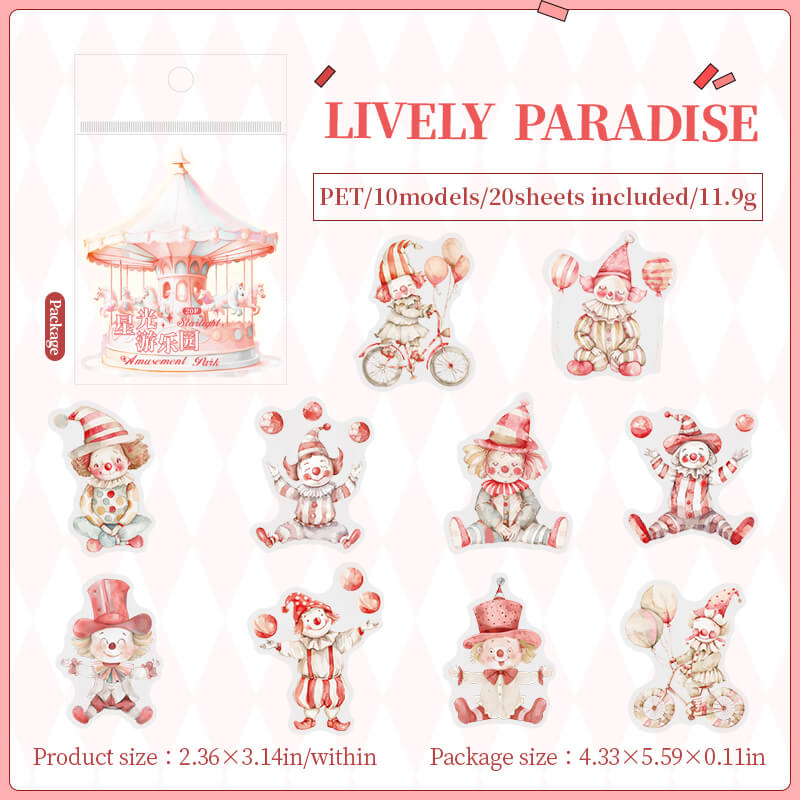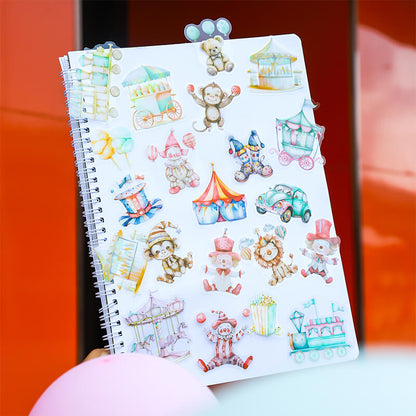 Starlight Amusement Park stickers feature a carousel, cute clowns, silly animals and dessert stations in bright colors and childlike fun. Every detail is full of joy, suitable for decorating handbooks and cards, adding a dreamy and pleasant atmosphere.