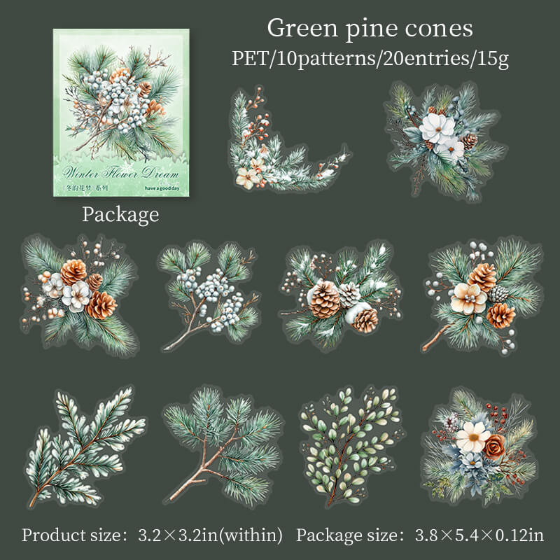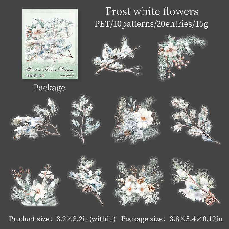 Winter Flower Branch Stickers, inspired by the natural scenery of the cold season, incorporate snowflakes, frost and winter floral elements. The delicate flower branch pattern with light snowflakes creates a serene and cozy winter atmosphere. Suitable for decorating handbooks, greeting cards or other creative works, adding a touch of vividness and poetry to the winter season