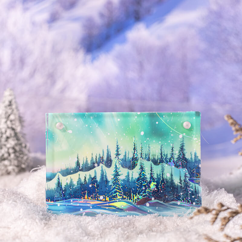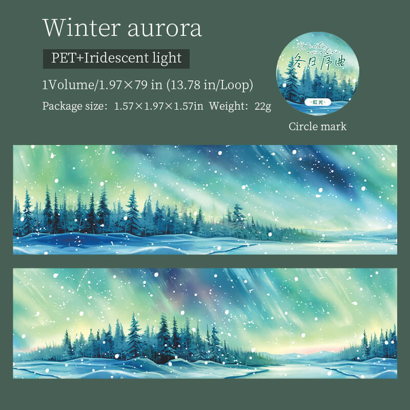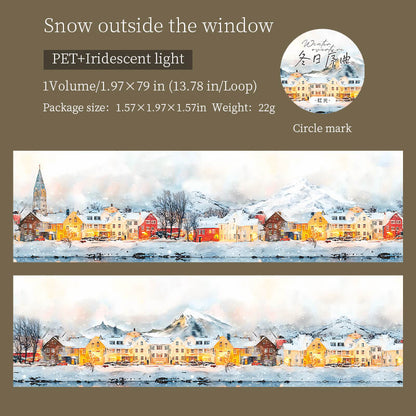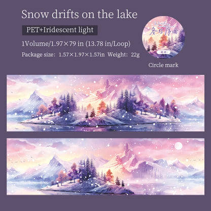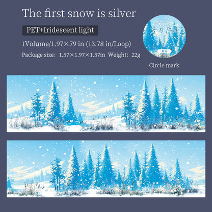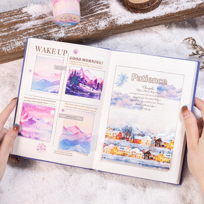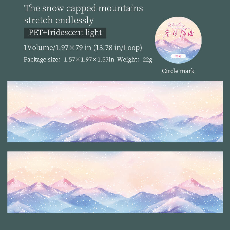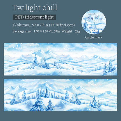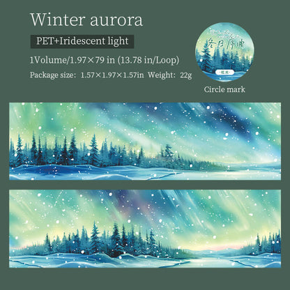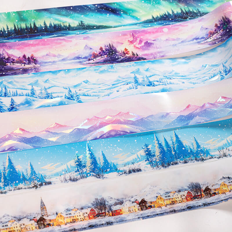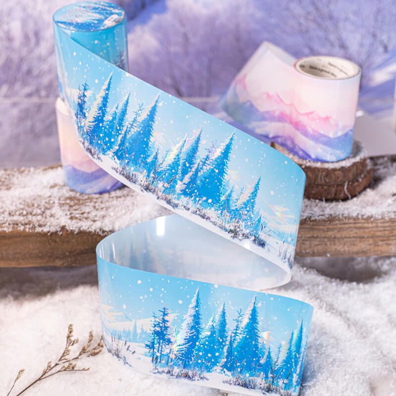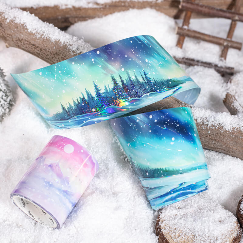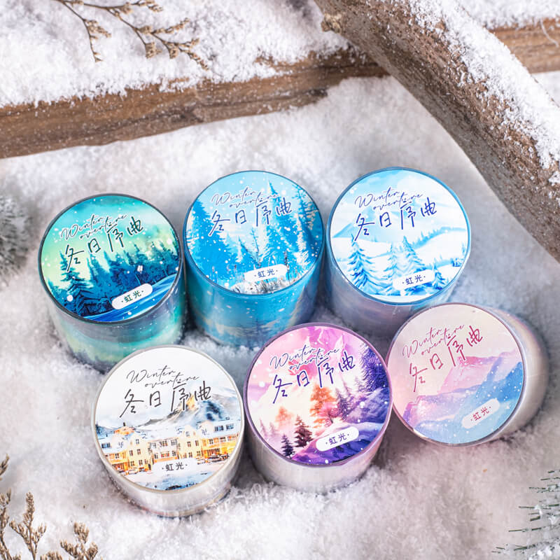 Winter Iridescent Landscape Tape incorporates a wonderful interplay of snow and light, colorful and glossy for a unique iridescent effect. Each roll of tape seems to capture the enchanting glow of the winter sunlight refracted on the snow, adding a dreamy touch to handbooks and decorations.