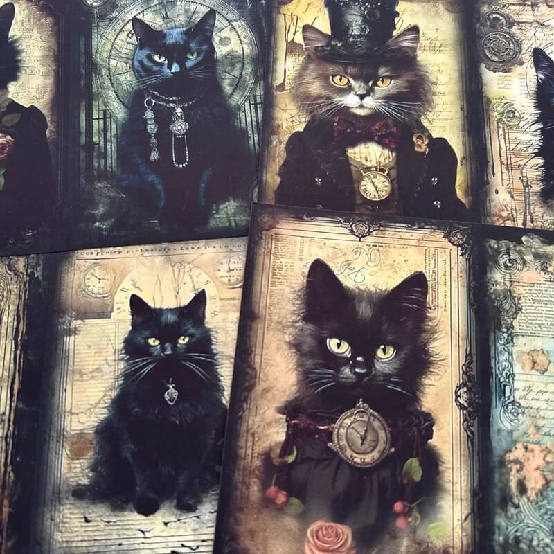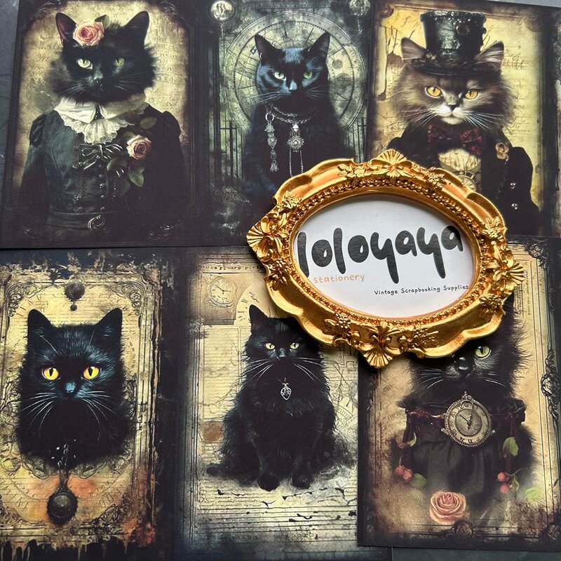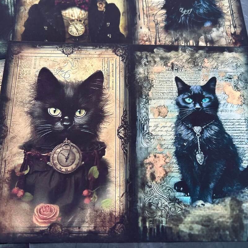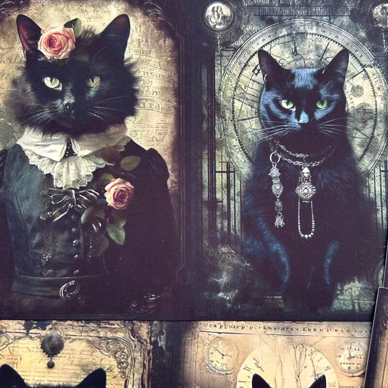 Gothic punk black cat material paper, featuring a mysterious black cat image with dark tones exudes a unique gothic style. The paper is thick and suitable for handbook, collage and art creation, adding a touch of mystery and personality to your work, perfectly presenting the beauty and emotion of darkness.
