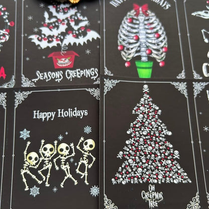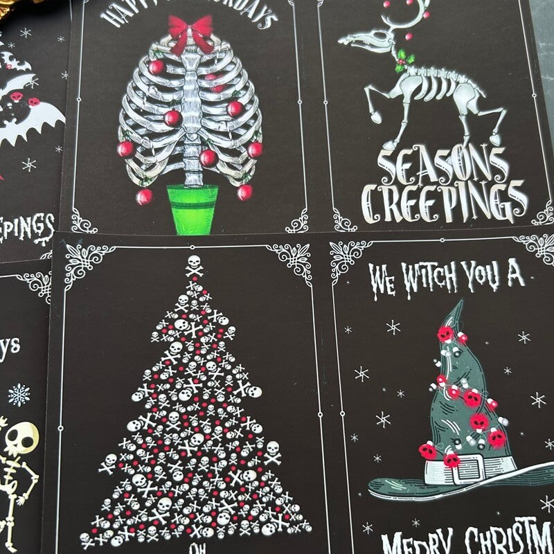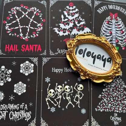 Dark grotesque Christmas material paper has a unique style, blending gothic elements with traditional symbols of Christmas, such as skeleton snowman, skeleton elk, ghostly Christmas tree and so on. The color tone is mainly black and deep red, full of mystery, suitable for making alternative, grotesque style greeting cards, handbook collage or creative packaging.